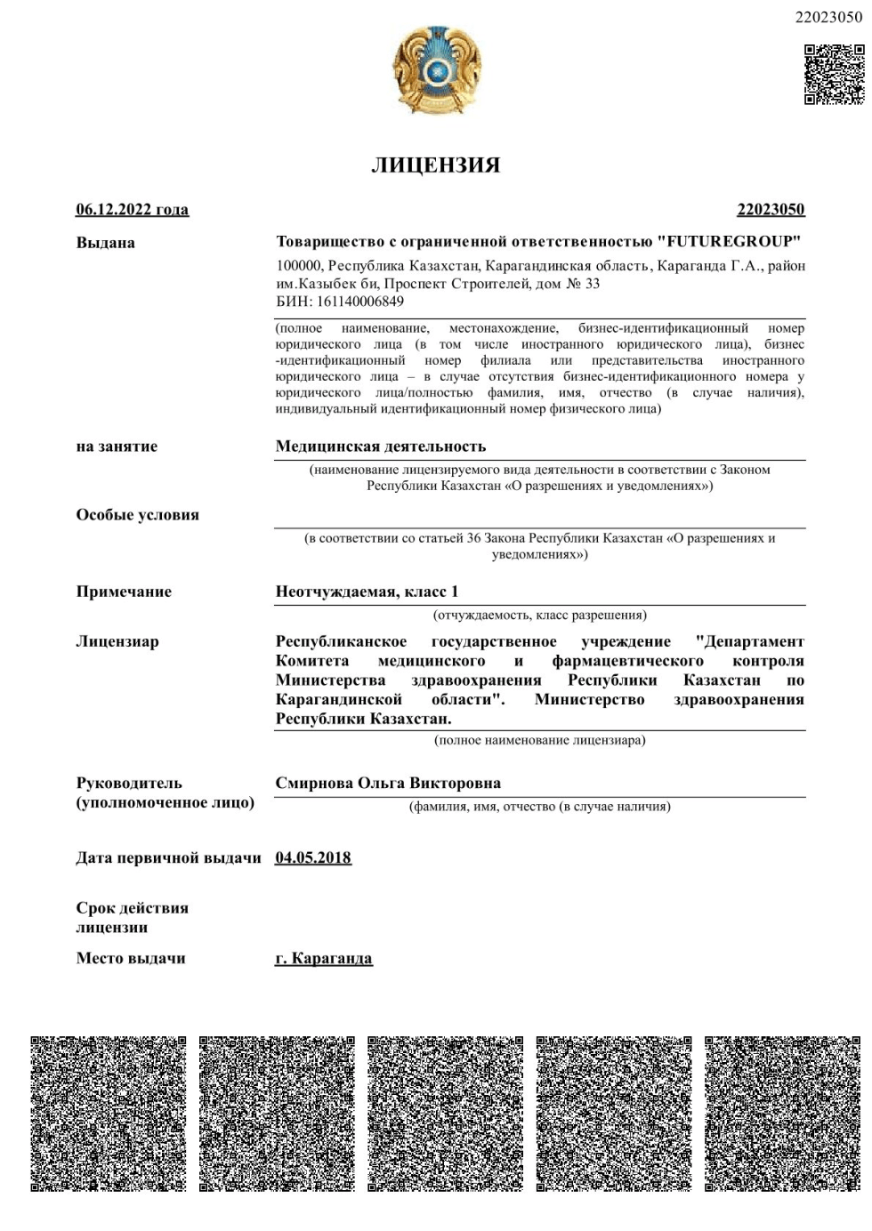Номер лицензии:22023050 Выдана:ТОО “FUTUREGROUP” На занятие:Медицинская деятельность Примечание:Неотчуждаемая, класс 1 Лицензиар:Республиканское государственное учреждение “Департамент Комитета медицинского и фармацевтического контроля Министерства здравоохранения Республики Казахстан по Карагандинской области”. Министерство здравоохранения Республики Казахстан”. Руководитель:Смирнова Ольга Викторовна Дата первичной выдачи:04.05.2018 Место выдачи:г. Караганда